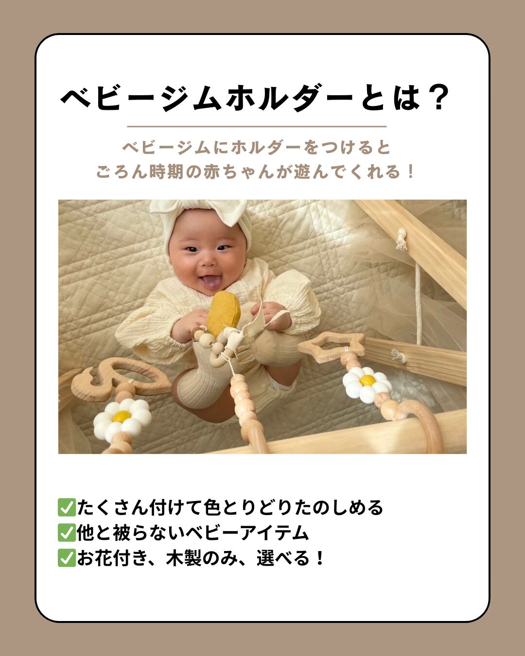1番右デザイン、丸と星の木製ラトルがついたジムホルダーを作成できます!